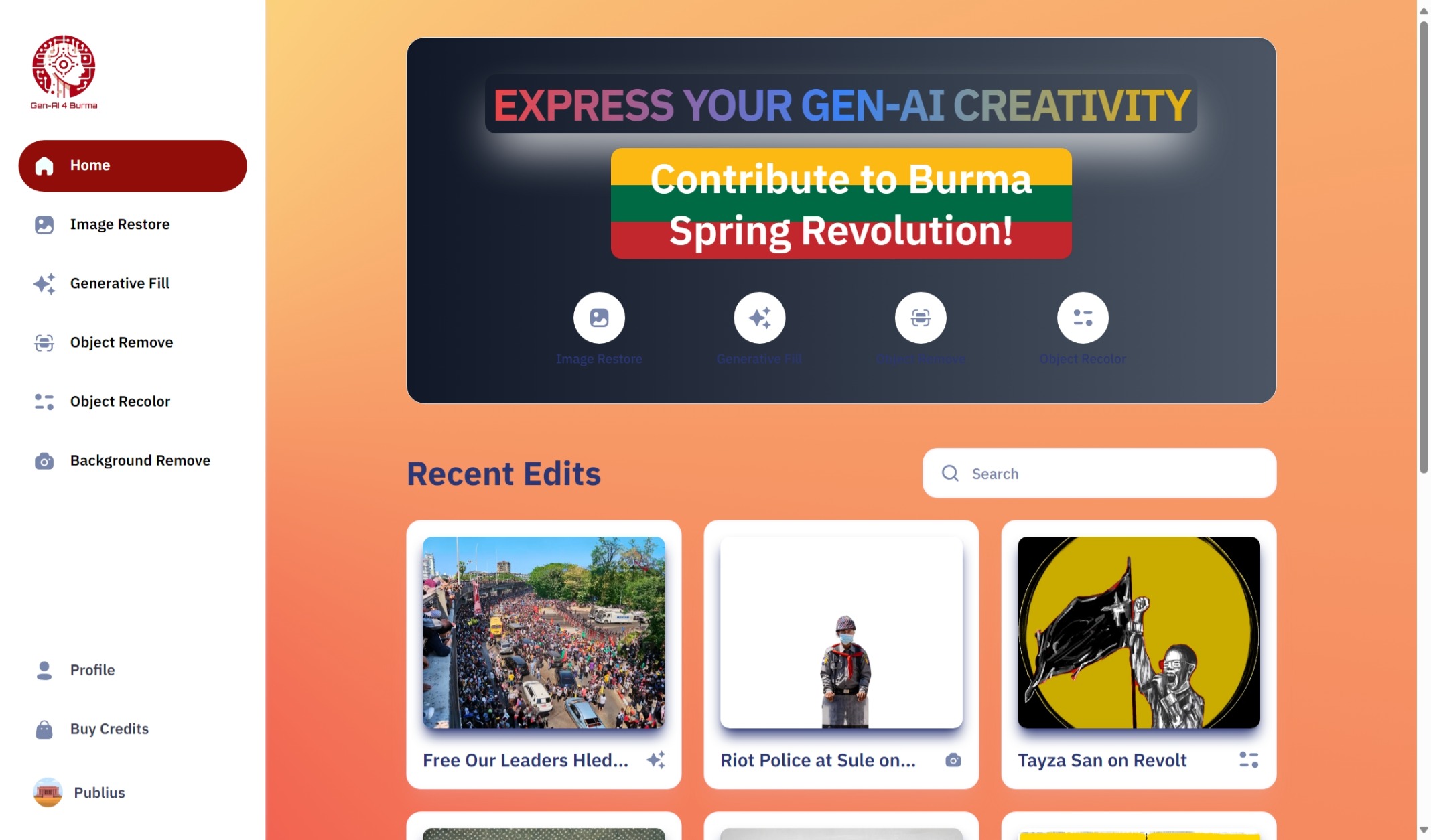 Gen AI 4 Burma is a SasS web app that enables users to apply various AI-powered transformations to their images, such as restoration, recoloring, generative fill, object removal, and background removal.