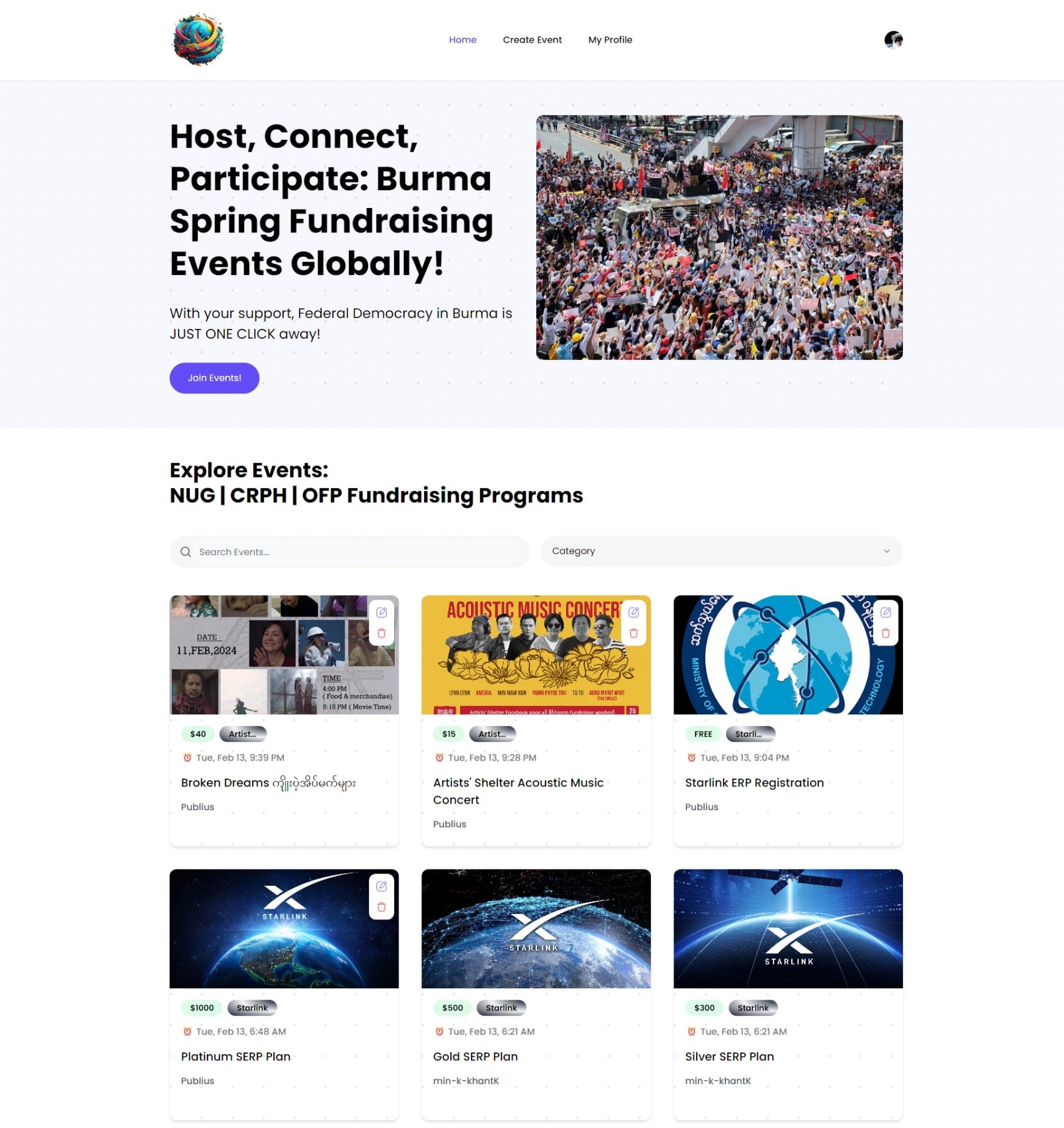 This project is a web application that allows users to create, join, and support events related to the Burma Spring Revolution. The platform aims to raise awareness, solidarity, and funds for the cause, as well as to connect activists, organizers, and supporters from around the world.